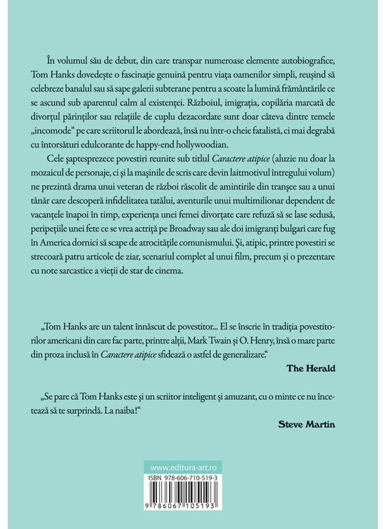 Caractere atipice reprezinta volumul de debut al celebrului actor Tom Hanks, o colectie de saptesprezece povestiri ce dezvaluie un talent narativ surprinzator si o fascinatie profunda pentru viata oamenilor obisnuiti. Titlul cartii face o trimitere dubla: pe de o parte la mozaicul de personaje neconventionale si, pe de alta parte, la masinile de scris, care devin un laitmotiv vizual si simbolic al intregului volum. Autorul abordeaza teme universale si complexe, precum urmarile razboiului, provocarile imigratiei sau fragilitatea relatiilor de cuplu, fara a cadea insa intr-o nota fatalista. Printre pagini intalnim veterani marcati de amintiri, tineri care descopera secrete de familie, dar si situatii fantastice, precum calatorii in timp sau note sarcastice despre viata unui star de cinema. Constructia volumului este ea insasi atipica, incluzand articole de ziar si chiar scenariul complet al unui film. Cartea are 448 de pagini, este disponibila intr-un format paperback de 13.5 x 20 cm si a fost publicata in anul 2018.