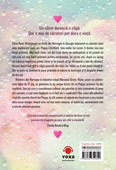 O mie de saruturi este un roman intens, scris cu sensibilitate și emoție, care vorbește despre dragostea care se naște devreme, despre promisiuni fragile și despre momentele care, deși durează o clipă, pot rămâne pentru totdeauna în inimă.