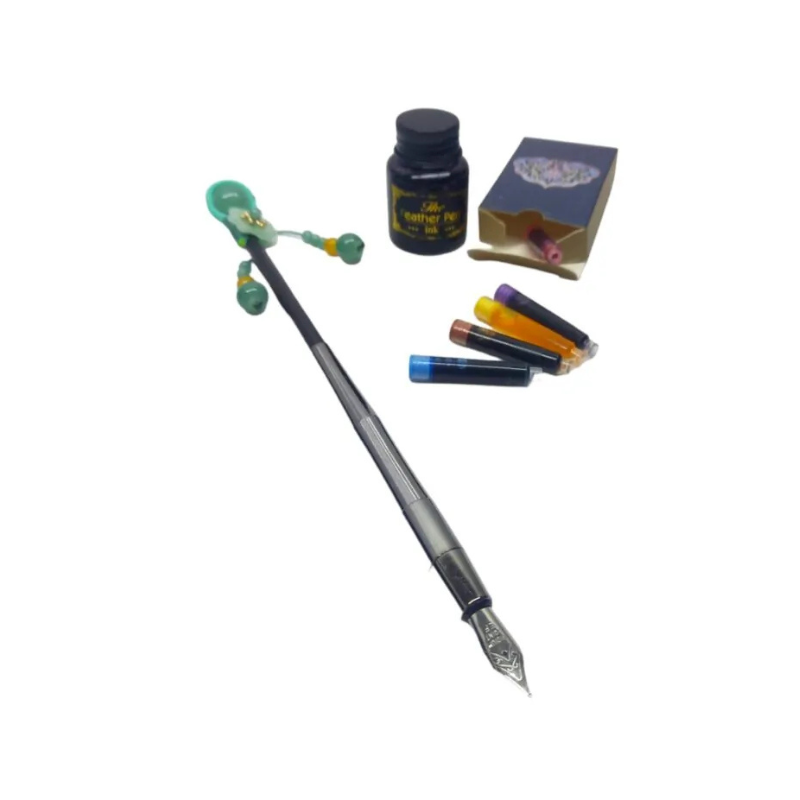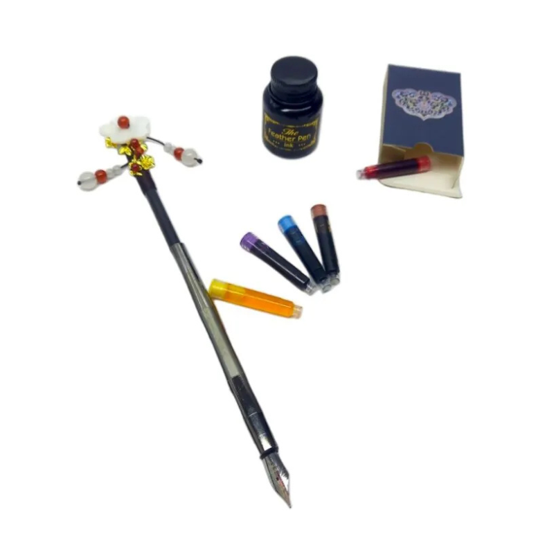 Setul vine într-o cutie elegantă și include o calimară cu cerneală, fiind potrivit pentru caligrafie, scris de mână sau pentru a fi oferit cadou cuiva pasionat de scris și papetărie deosebită. Ideal pentru ocazii speciale, decor de birou sau pur și simplu pentru a te bucura de frumusețea scrisului cu stil.