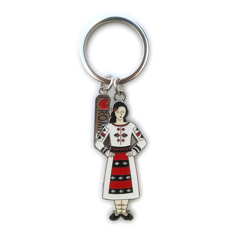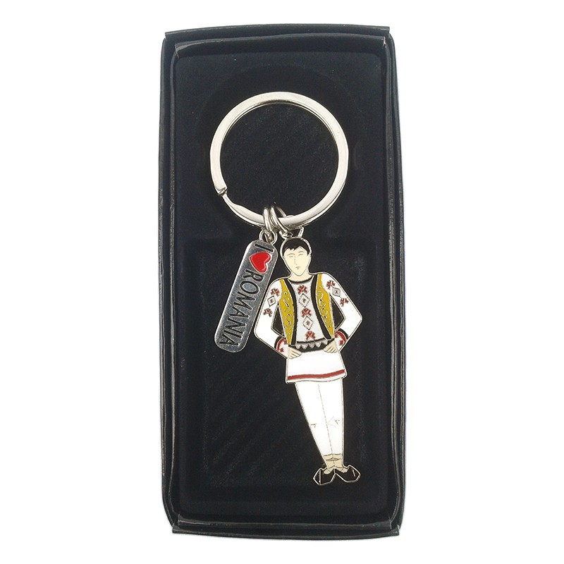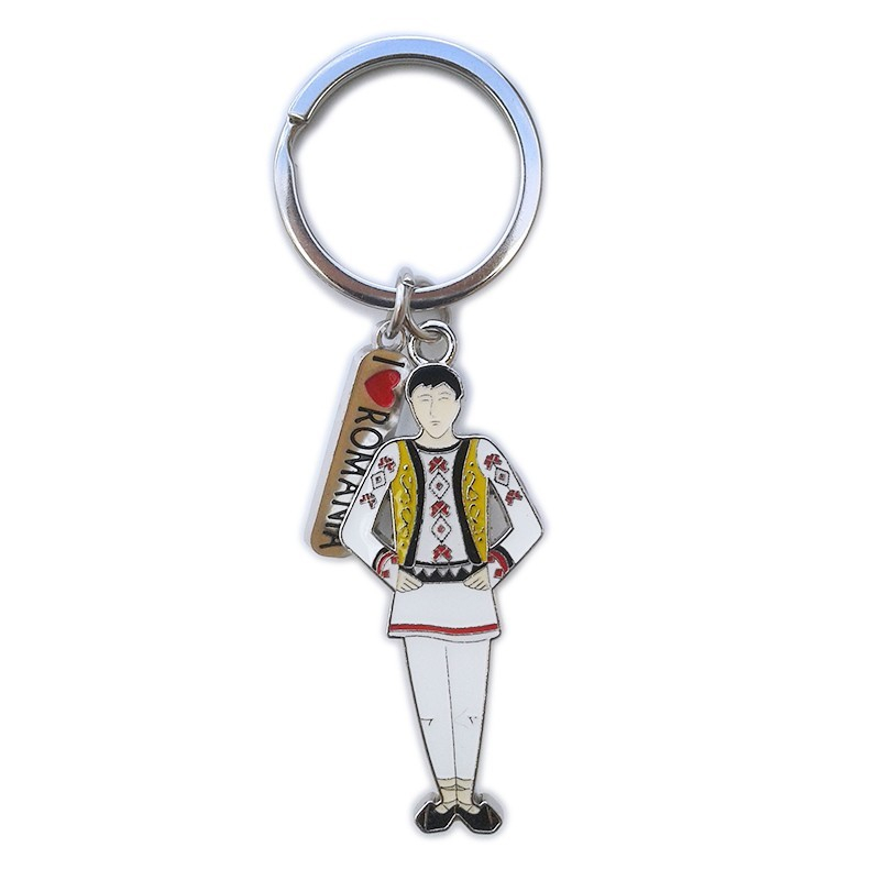 Breloc metalic reprezentand un om in costum national si text "Romania".