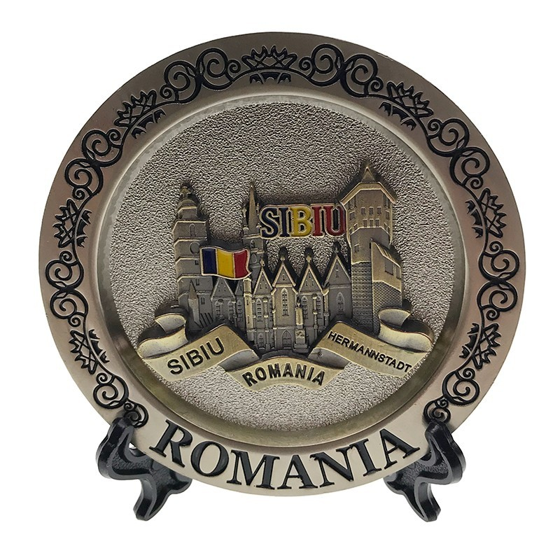 Aplica în formă de farfurie metalică cu Sibiu este un obiect decorativ cu un aer clasic și rafinat, creat pentru a pune în valoare unul dintre cele mai frumoase orașe din România. Partea centrală este realizată din metal, cu striații fine și detalii atent lucrate ce reprezintă clădiri emblematice ale orașului, alături de denumirea Sibiu și România, oferind un aspect autentic și bine definit.