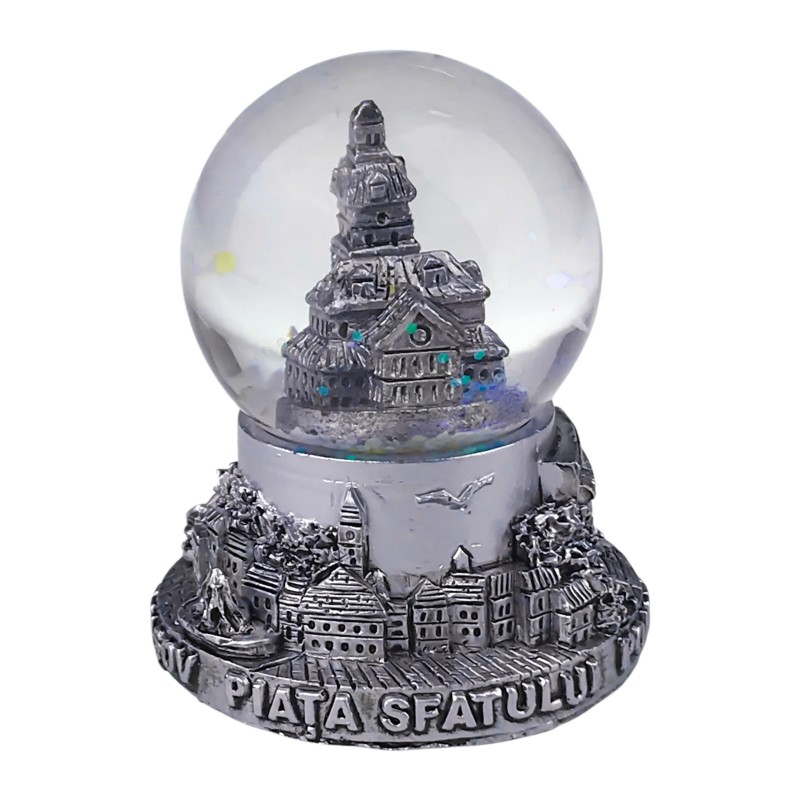 Glob din sticlă pe suport din rășină cu Brașov, un suvenir elegant ce surprinde simboluri reprezentative ale orașului. Miniaturile detaliate redau monumente cunoscute într-un design decorativ rafinat. Este ideal pentru colecție sau pentru a fi oferit cadou.