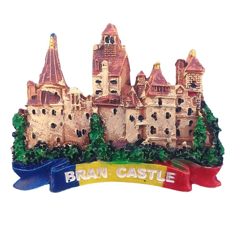 Magnet din rășină cu Castelul Bran și text în limba engleză, realizat în relief și în culori decorative. Dimensiunea compactă îl face potrivit pentru orice suprafață metalică.