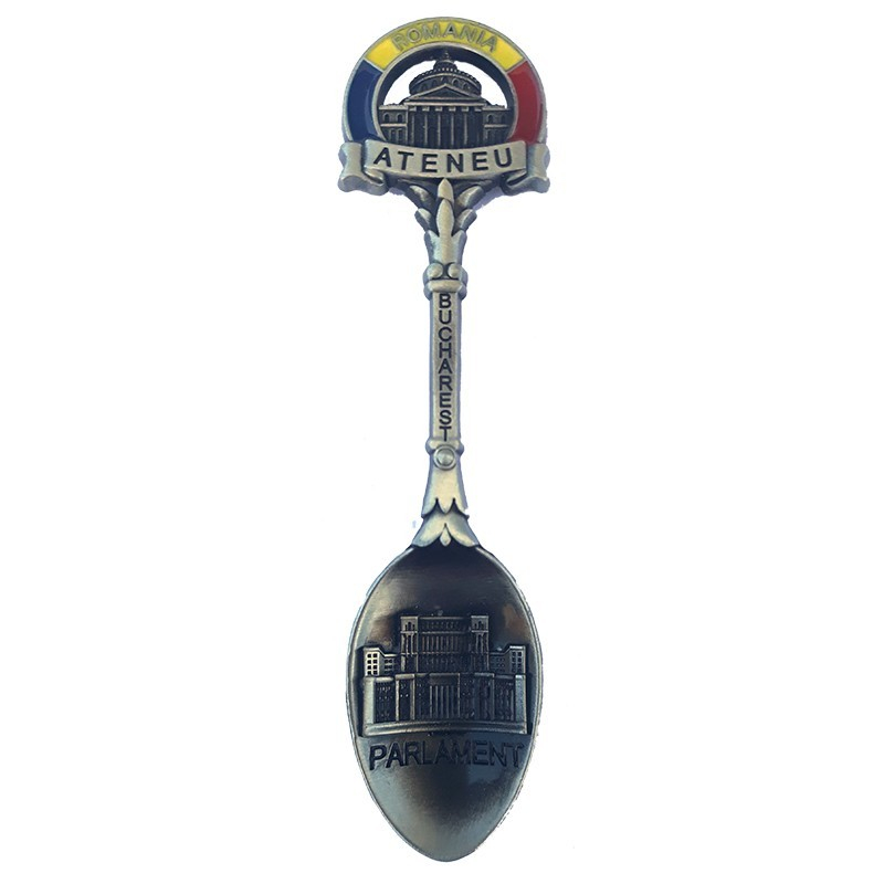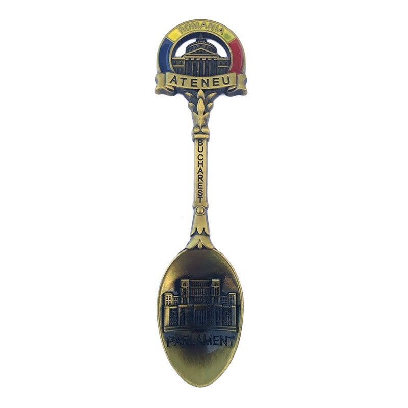 Magnet metalic decorativ în formă de linguriță, cu inscripția București. Designul este realizat în stil clasic, cu detalii reliefate. Potrivit ca suvenir din capitala României.