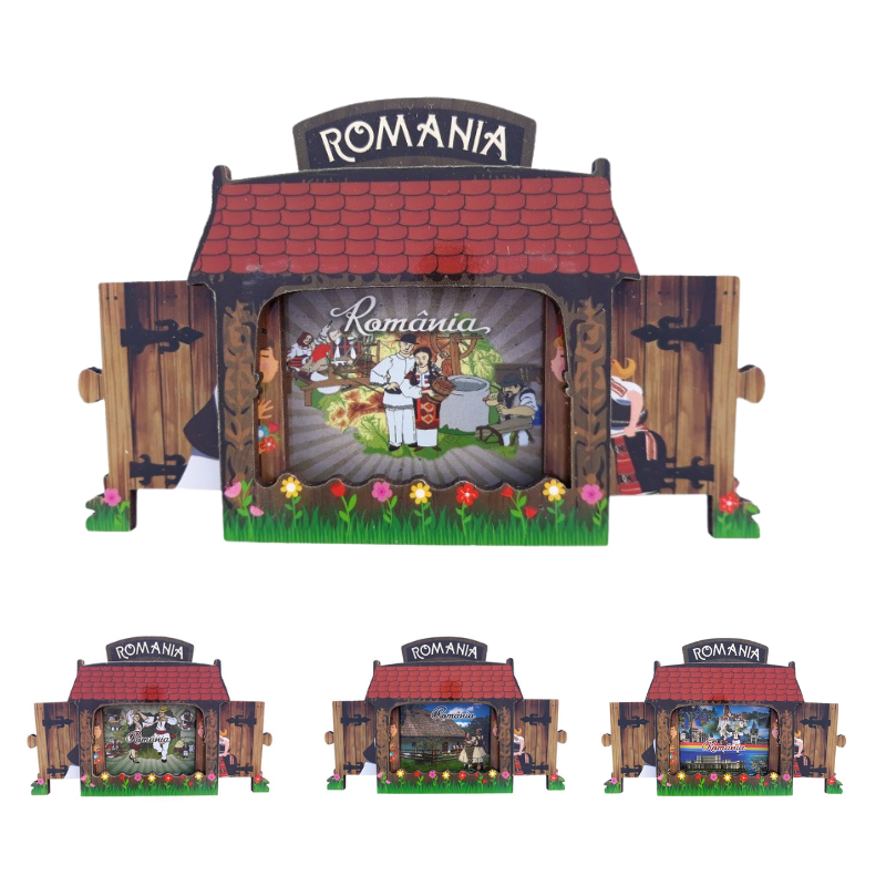 Magnet decorativ din lemn, în formă de casă țărănească, cu portițe mobile care se deschid lateral. Ilustrează scene tradiționale și peisaje din România, fiind un suvenir original și plin de farmec. Ideal pentru frigider sau alte suprafețe metalice.
