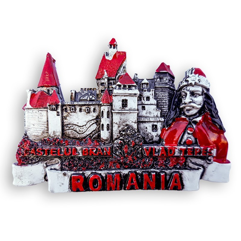 Acest magnet din rășină surprinde într-un mod expresiv Castelul Bran alături de figura lui Vlad Țepeș, două simboluri puternice ale istoriei și legendelor românești.