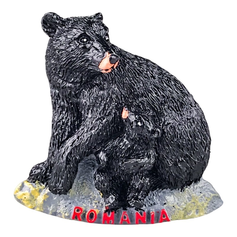 Acest magnet din rășină reprezintă o scenă sugestivă cu un urs și puiul său, simbol al naturii sălbatice din România.
