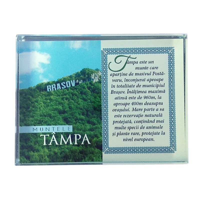 Prisma din sticlă cu imagini reprezentative din Brașov este un obiect decorativ rafinat, realizat din sticlă transparentă, cu muchii bine finisate.