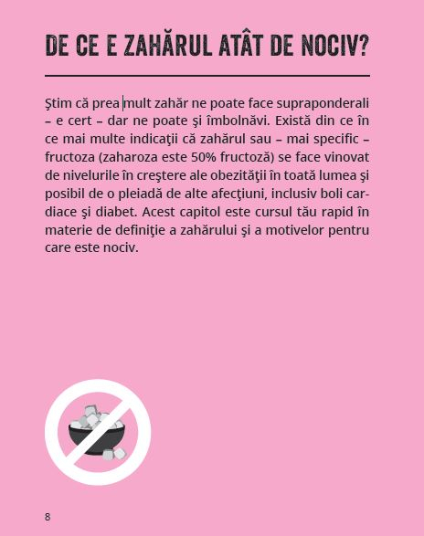 Volumul cuprinde rețete fără zahăr, idei de înlocuitori naturali, secțiuni de întrebări și răspunsuri pentru clarificarea celor mai frecvente nelămuriri și explicații despre citirea corectă a etichetelor alimentelor. Este un ghid complet pentru oricine își dorește să adopte un stil de viață mai sănătos, fără a renunța la plăcerea gustului.
