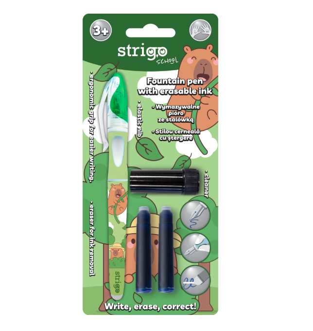 Stiloul Strigo cerneala cu stergere Capybara verde combina functionalitatea cu un design atractiv pentru cei mici. Varful din iridium asigura o scriere cursiva si precisa, iar forma ergonomica il face usor de tinut in mana chiar si in sesiunile lungi de scris.