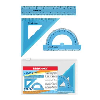 Set de geometrie, translucid, din plastic de înaltă calitate. Setul include 3 articole: o riglă cu două fețe de 15 cm, un echer de 9 cm/45°, un raportor de 180°/10cm.