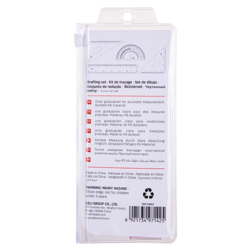 Setul de geometrie DELI cu 4 piese este realizat din material plastic multicolor, fiind potrivit pentru utilizarea zilnică la școală. Conține sau riglă de 15 cm, două echere și un raportor, instrumente necesare pentru realizarea desenelor tehnice și a exercițiilor de geometrie. Piesele sunt ușor de manevrat și rezistente, iar setul este disponibil în două variante de design. Este o alegere practică pentru elevi, oferind instrumente de bază pentru activitățile de matematică și desen tehnic.