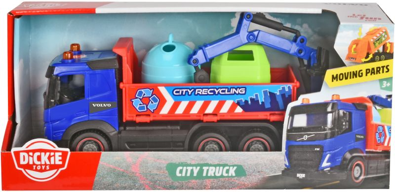 Camioane cu cabina si frictiune 23 cm, cu licenta Volvo, cu piese mobile si accesorii. Datorita actionarii cu frecare, camioanele de jucarie pot parcurge singure o distanta scurta de indata ce sunt impinse. Camion de reciclare: container de sticla detasabil, brat mobil de macara pentru incarcare si descarcare, containerul poate fi umplut si golit.