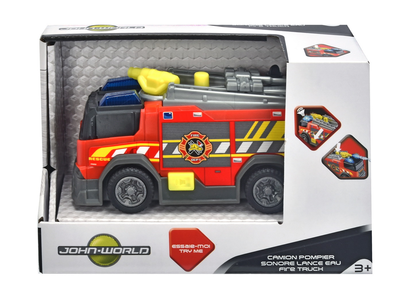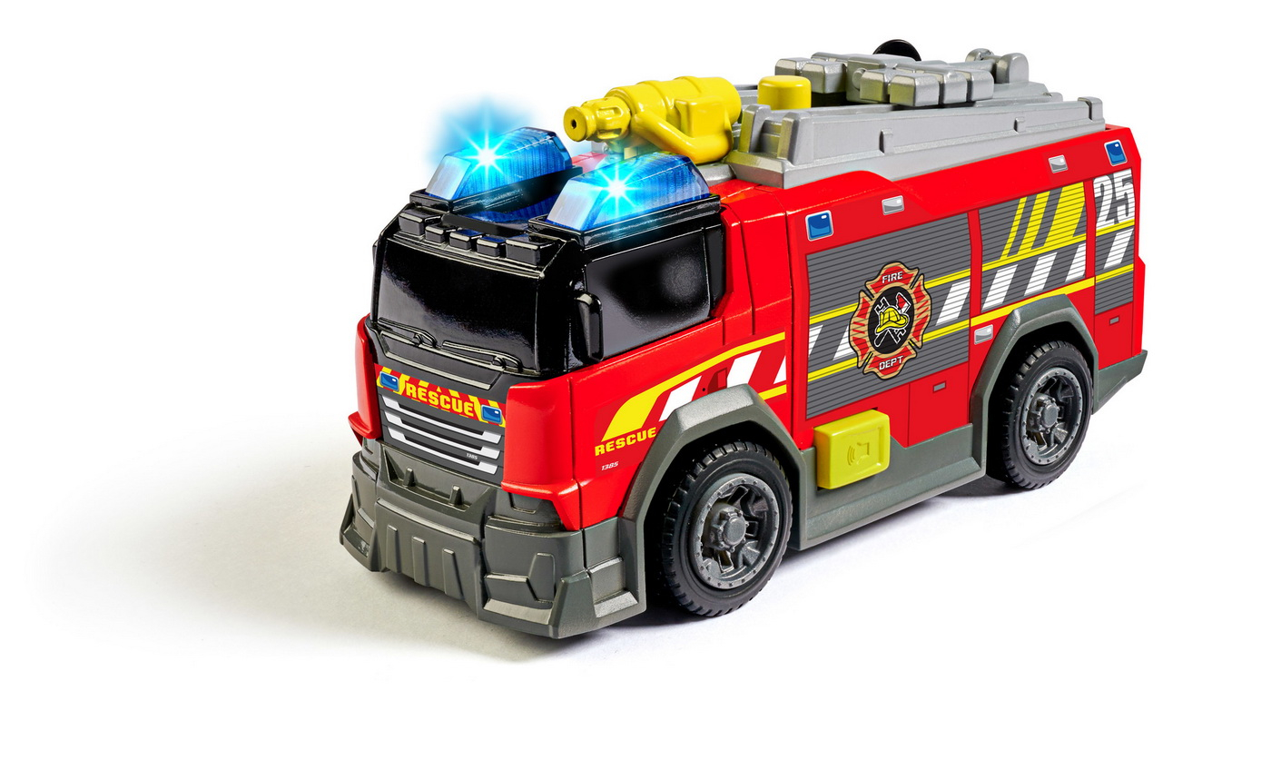 Dickie Toys – masina de pompieri – cu functie de tun cu apa, sirena si lumina, roti rotative, lungime 15 cm. Multi copii viseaza sa se alature pompierilor. Potrivit pentru utilizare in interior si in aer liber, acest vehicul de jucarie le permite tinerilor sa intre in lumea unui pompier si sa invat despre functiile unei masini de pompieri. Masina de pompieri rosie are roti rotative si este usor de manevrat de copiii mici. Pe langa caracteristicile distractive, masina de pompieri ajuta si la antrenarea abilitatilor motorii fine. Cu functia de pulverizare cu apa, puteti chiar pulveriza apa din pistolul de apa incorporat. Proiectoarele pot fi si pozitionate pe plafonul vehiculului.