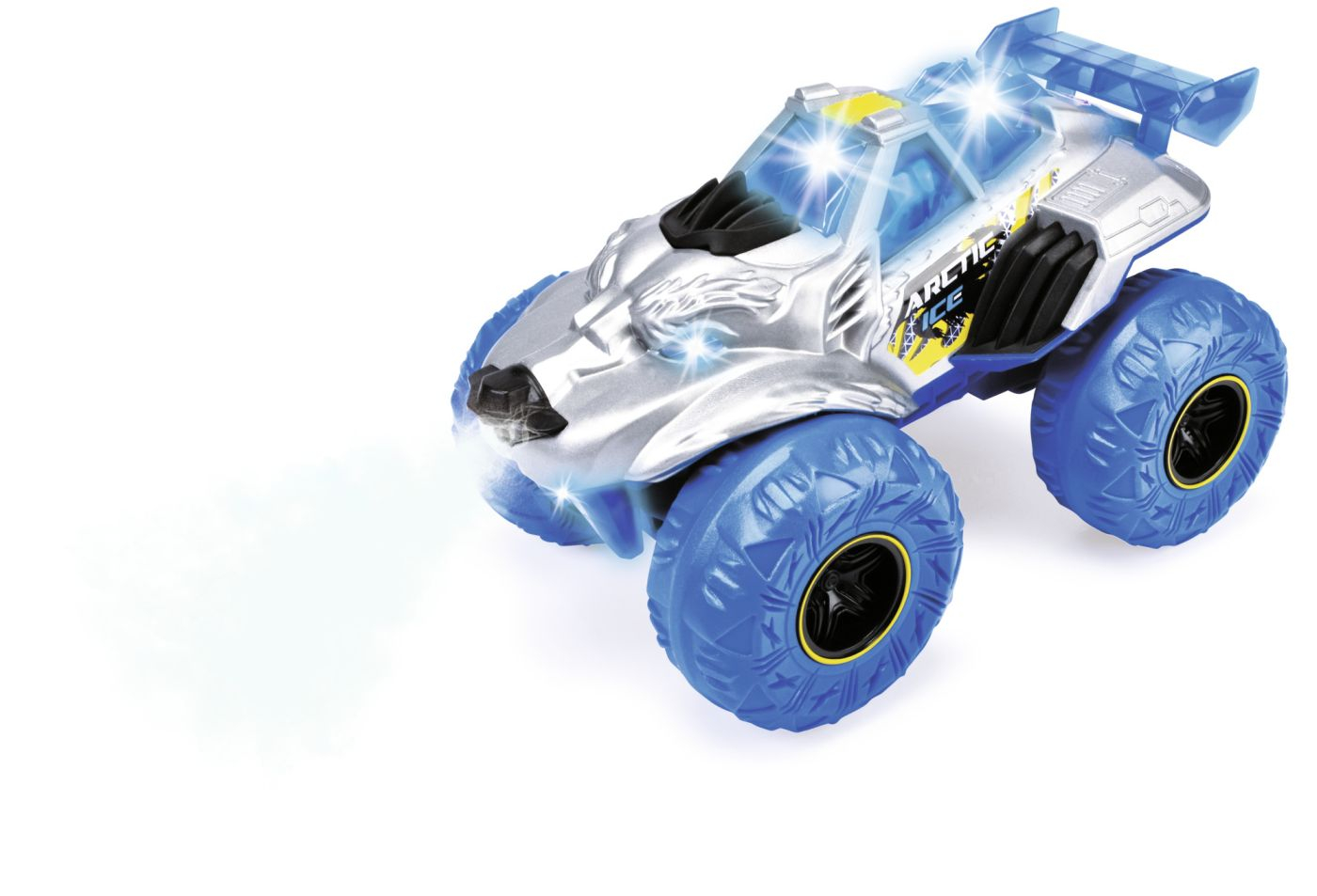 Masina de teren Arctic Ice Monster pentru copii de la 3 ani in sus, cu functie de abur si anvelope de cauciuc, masinuta de jucarie cu roti libere pentru copii, lumini si sunete, baterii incluse. Cool ca un monstru. Impresionantul Arctic Ice Monster albastru isi are originea in intinderile inghetate ale Arcticii si acum isi face ture de gheata in camera copiilor ca masinuta de jucarie. Masinuta de inalta calitate. Cele 4 roti de cauciuc extra-mari si suspensie puntii spate asigurate o rulare lina a camionului monstru cu roti libere, ideala ca jucarie pentru copiii de la 3 ani in sus. Functie de vapori de apa. Cand masinuta de jucarie este umpluta cu apa folosita sticla inclusa, monstrul de gheata „respira” vapori de apa reali si invaluieste imprejurimile intr-un nor rece de ceata. Efecte speciale. Functiile de lumina si sunet (baterii incluse) transforma masinuta copiilor intr-un aisberg stralucitor, cu sunetul sau monstruos si dintii frontali.
