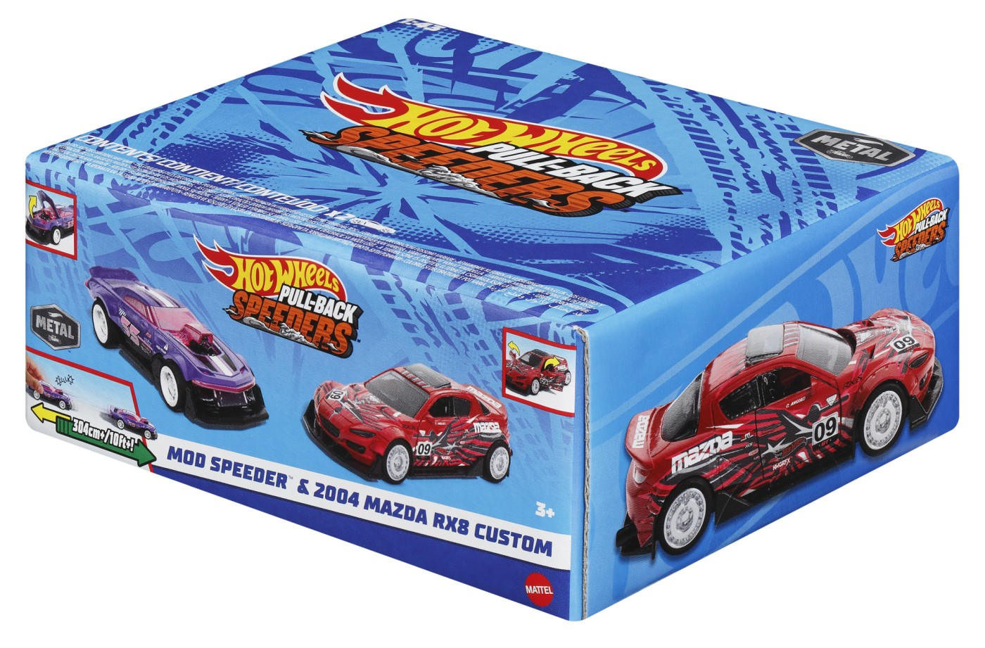 Pachetul de 2 masini cu cu sistem pull back de la Hot Wheels Speeders promit curse interesante. Masinile pot fi trase inapoi si eliberate pe podele si covoare pentru o cursa interesanta. Toate masinile la scara 1:43 ofera o caracteristica interactiva grozava, de ex. Rolomatice pentru usi, clapete de portbagaj si capote care pot fi deschise.Decoratiunile detaliate fac ca inimile copiilor si colectionarilor sa bata mai repede. Vehiculele Hot Wheels Speeders sunt un cadou grozav pentru copiii de la 3 ani in sus. Acest pachet contine masinutele Mod Speeder si 2004 Mazda RX8 Custom.