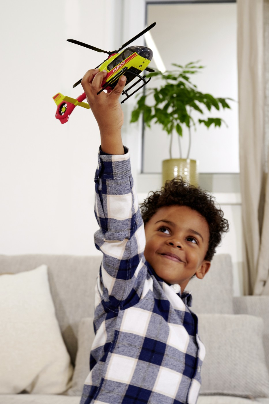 Elicopter de salvare Majorette Airbus H135 cu lumini si sunete. Elicopterul are elice rotative, efecte luminoase si sonore, o lumina de avertizare albastra si doua efecte sonore grozave care pot fi activate prin apasarea mijlocului elicei. .