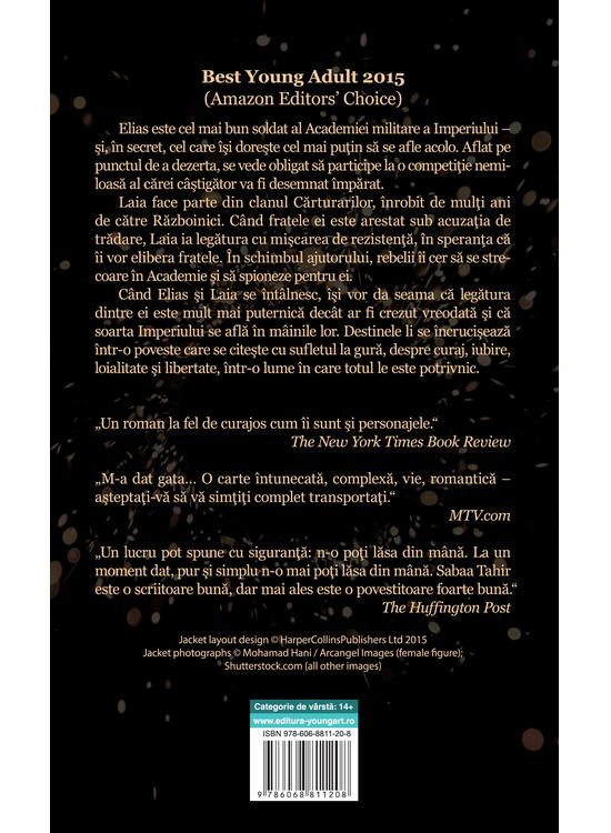 Elias este cel mai bun soldat al Academiei militare a Imperiului, deși în secret își dorește mai mult decât orice să scape de această viață. În momentul în care este forțat să participe la o competiție sângeroasă al cărei câștigător va deveni împărat, planurile lui de a dezerta sunt puse la încercare. Laia, provenită din clanul Cărturarilor asupriți, acceptă o misiune extrem de periculoasă pentru a-și salva fratele arestat, infiltrându-se în Academie ca spioană. Întâlnirea dintre Elias și Laia declanșează o legătură neașteptată, iar alegerile lor ajung să influențeze soarta întregului Imperiu. Romanul spune o poveste intensă despre libertate, loialitate, iubire și rezistență, într-o lume dură, unde speranța pare aproape imposibilă.